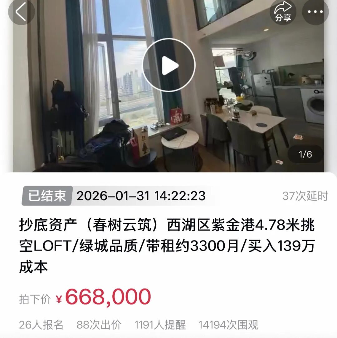 翻开近期阿里资产上通过商拍成交的杭州酒店式公寓,多数是割肉房源。比如2月1日成交的新杭商务中心商住房,面积31.77平方米,公告显示买入价为137万元,共11人报名,最终以48.5万元成交,几乎打了4折;1月31日成交的带租约LOFT春树云筑,买入价139万元,面积49.02平方米,有26人报名,88次出价,超14000次围观,最终以66.8万元成交,同样几乎腰斩……