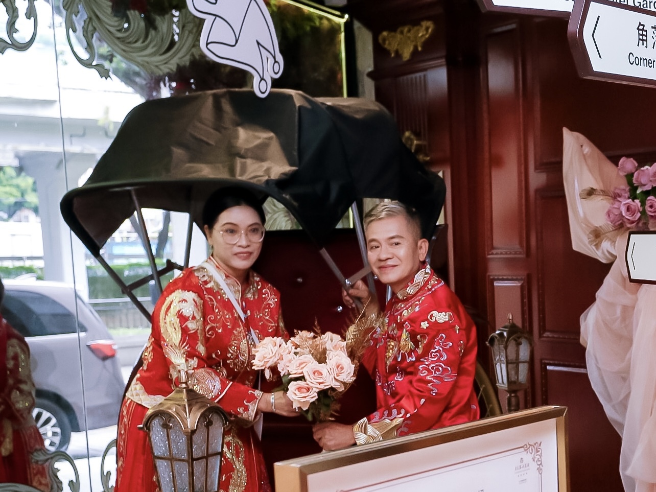 婚照拍摄则选址于广东胜利宾馆博物馆,馆内陈列的老照片、旧电话、黑胶唱片机等老物件,宛如一把“时光钥匙”,瞬间唤起了长者们往昔的记忆。金婚银婚夫妇们身着精美秀禾服,在充满历史感的氛围中,留下了“执子之手”的永恒画面。
